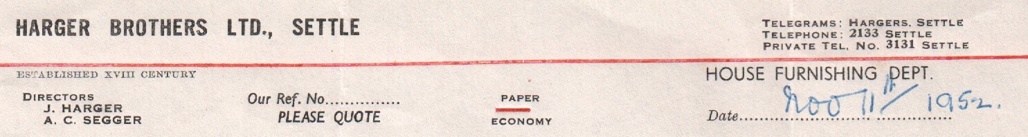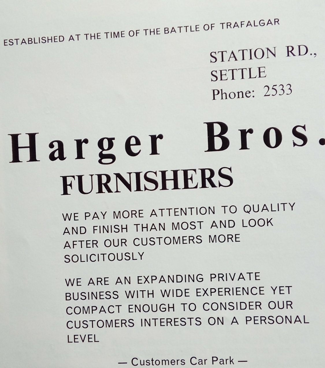 Business: Hargers' business (furniture shop and sawmill etc) was established approximately 1805/1806, possibly by Robert Harger. See for example: "Established XVIII century" or "Established at the time of the Battle of Trafalgar". It had premises in Settle on Goldielands, Station Road, and Cheapside at various times. From the WRMitchell archives (https://www.wrmitchellarchive.org.uk/), during an interview with Tom Dugdale: "There were the Harger Brothers, John and Thomas. Thomas was in charge of the building side and the joinery, and also he did fretwork. The other was John and he did the furnishing side, he did the upholstery, and John was very religious."