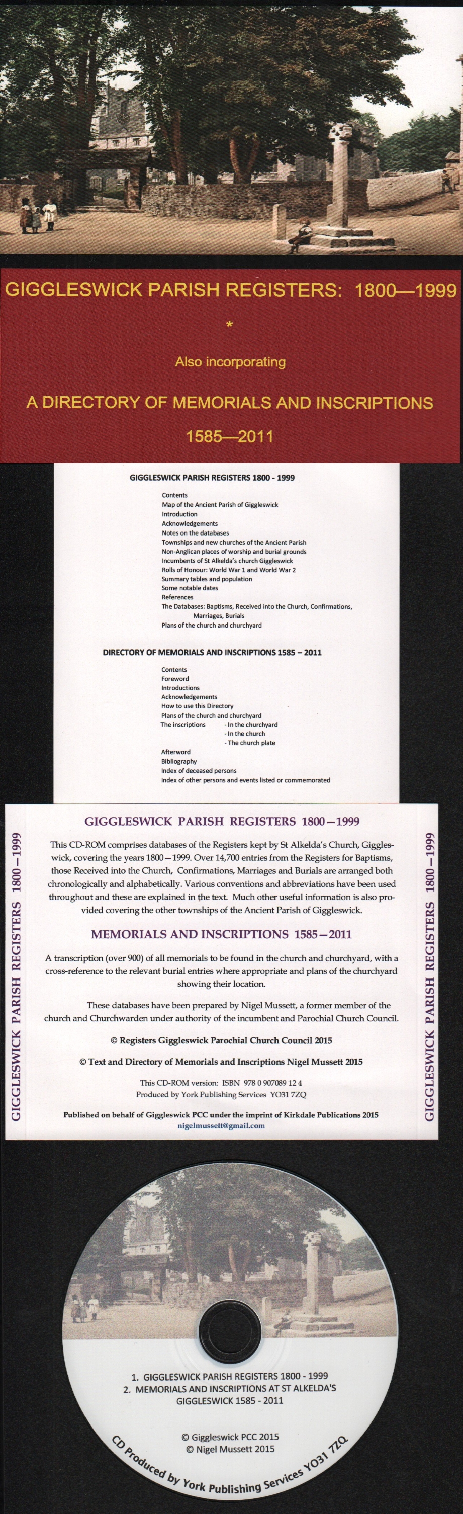 - "Giggleswick Parish Registers 1800-1999" (ed 2015) ISBN 9780907089100 (Hardback), ISBN 9780907089117 (Paper) (information: extract 4 pages, pdf, 0.3Mb)